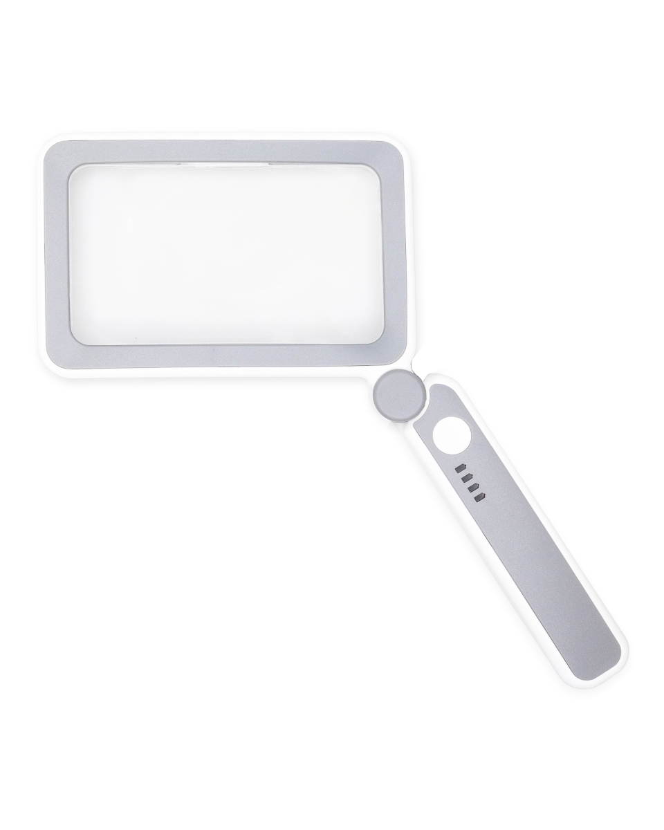 Leuchtlupe 2 fach (8dpt) · Acryllinse 110x65mm · Griff klappbar ·16 LEDs · 3 Helligkeitsstufen · Akku · USB-Ladebuchse