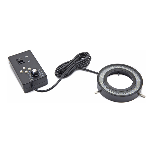LED-Ringlicht-Leuchte mit externer Helligkeits- und Segment-Steuerung. Zur nachträglichen Befestigung an allen gängigen Stereomikroskopen mit 60 mm Objektiv Kopfdurchmesser.