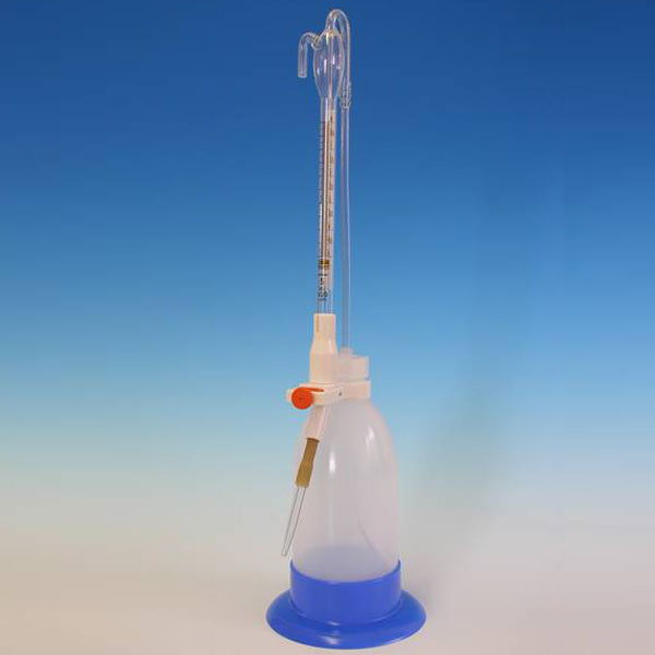 - Vorratsflasche aus Polyethylen mit Standfuß, Bürettenfüllung erfolgt durch leichten Druck auf die Flasche, dabei automatische Nullpunkteinstellung
