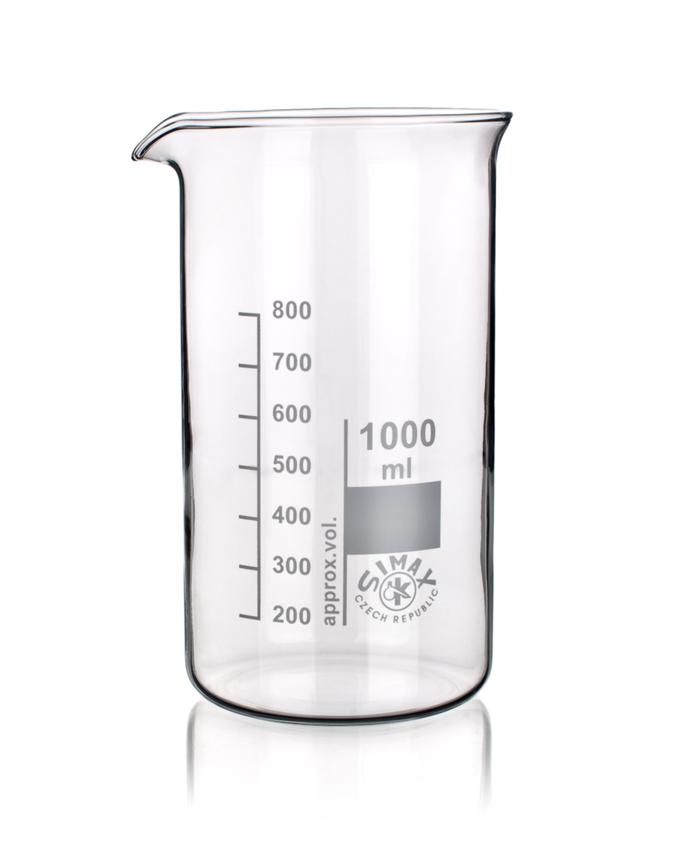 Becher aus SIMAX Borosilikatglas 3.3 mit einer hohen Beständigkeit gegen Temperaturänderungen und kurzfristigen Erhitzung bis 500 °C