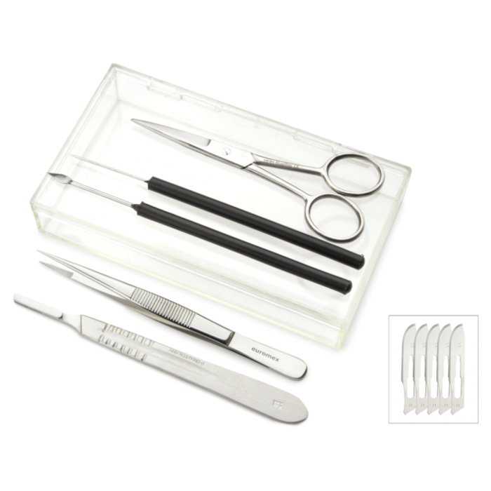 Präpariersatz für den Biologieunterricht oder Mikroskopieanfänger mit Edelstahl Instrumenten von höchster Qualität. Präparierbesteck in praktischer transparenten Kunststoffbox zum Stapeln.